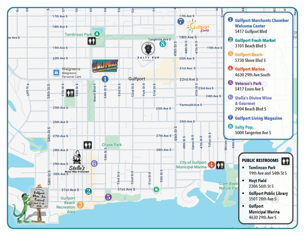 Paint Gulfport’s scenic locations and submit your favorite painting on Friday April 17th at the Gulfport Merchant Chamber Welcome Center between 1-2 PM and 4-5pm.
